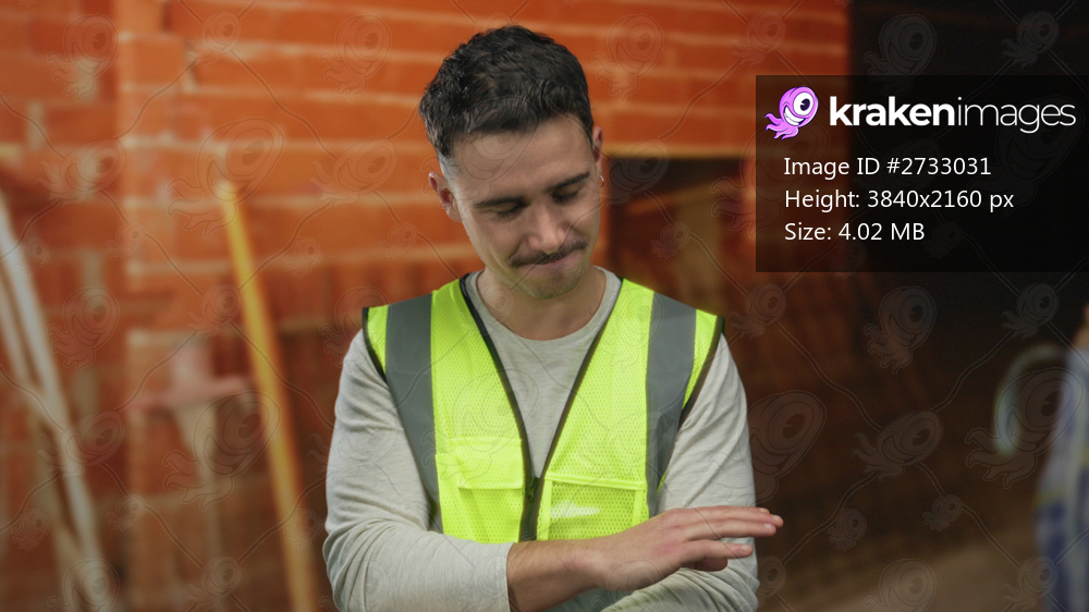 Young man in reflective vest gestures no with hands at indoor construction site against red brick wall.