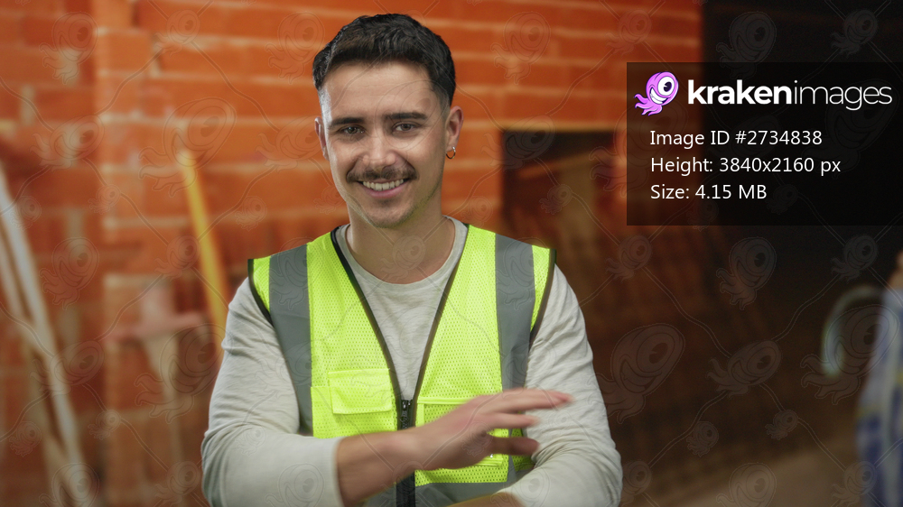 Young man in reflective vest gestures no with hands at indoor construction site against red brick wall.