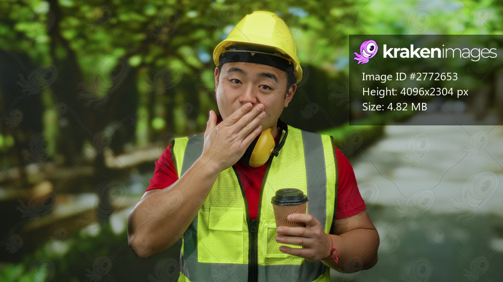 Young man in reflective vest and hard hat surprised in outdoor park holding coffee.