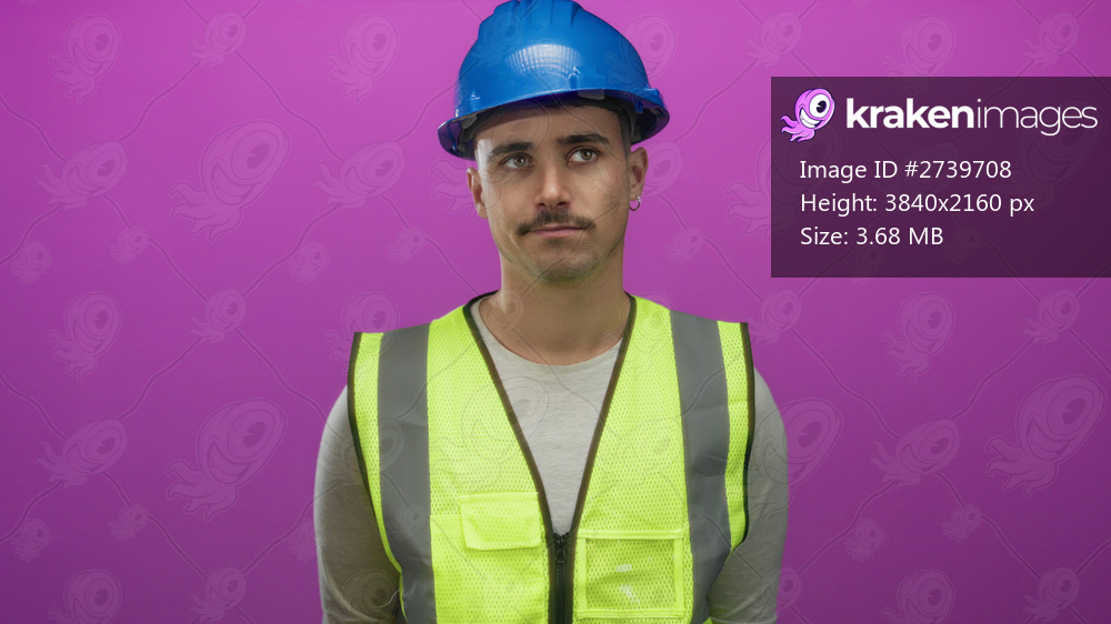 Young man in reflective vest and hardhat stands against an isolated pink background wall, appearing thoughtful and focused, embodying a professional and confident attitude. - Kraken Images