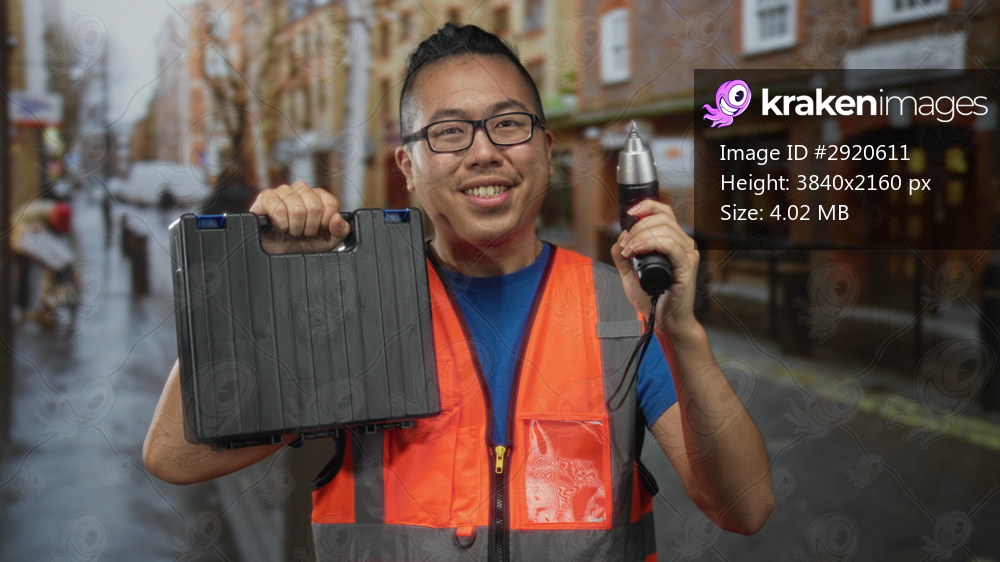 Young man in reflective vest holds drill and black toolbox on city street smiling while presenting tools; confidence skill service.