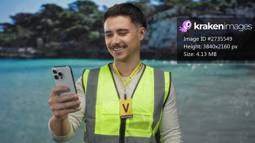 Young man in reflective vest on seaside capturing scenery with smartphone, volunteering outdoors, providing service under sunny, relaxing conditions with peaceful ocean backdrop. - Kraken Images