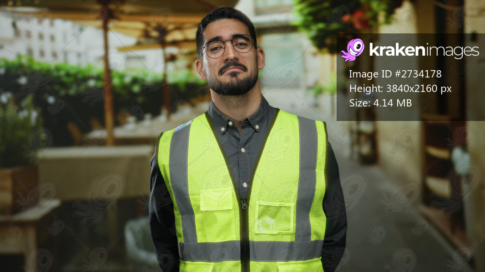 Young man in reflective vest stands confidently on outdoor restaurant terrace posing for portrait with stylish glasses and short hair under sunny umbrellas in background scene - Kraken Images