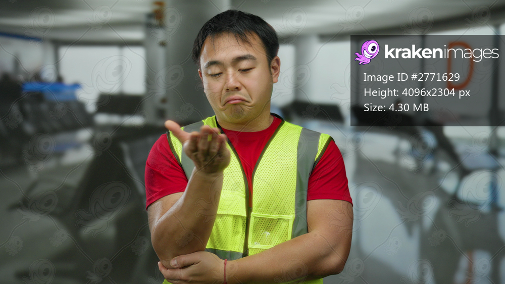 Young man in reflective vest stands thoughtfully in an empty airport terminal with seating arrangements and letter d visible in the background.