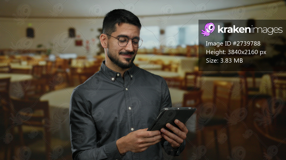 Young man in restaurant holding tablet smiling while wearing glasses and gray shirt in a cozy indoor setting with tables and chairs in the background.