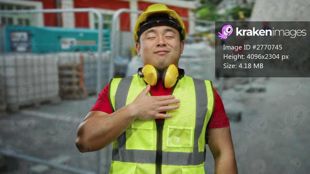 Young man in safety gear expresses gratitude at a construction site, wearing a yellow helmet and vest, showing asian ethnicity, and radiating warmth and satisfaction. - Kraken Images