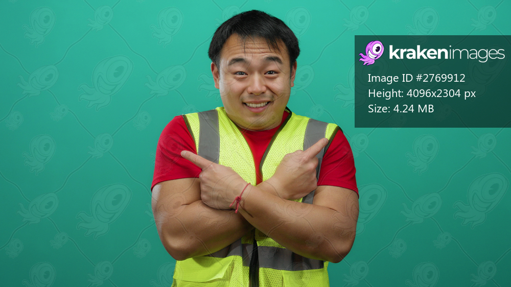 Young man in safety vest gestures confidently pointing against isolated green background, showcasing a sense of direction and assurance.