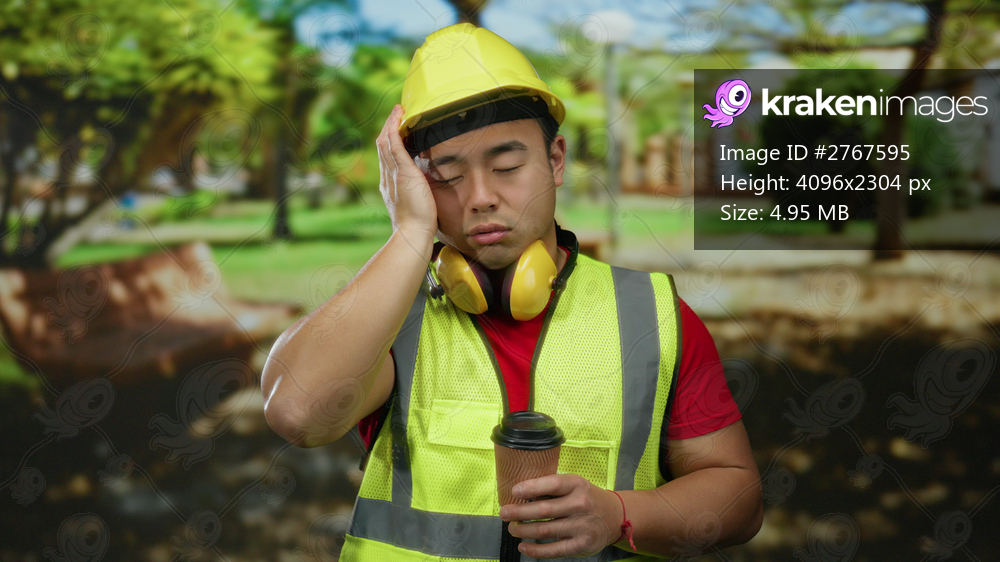 Young man in safety vest and hard hat holding coffee in park looks tired, expressing exhaustion while wearing protective gear outdoors in bright setting, surrounded by trees and nature. - Kraken Images