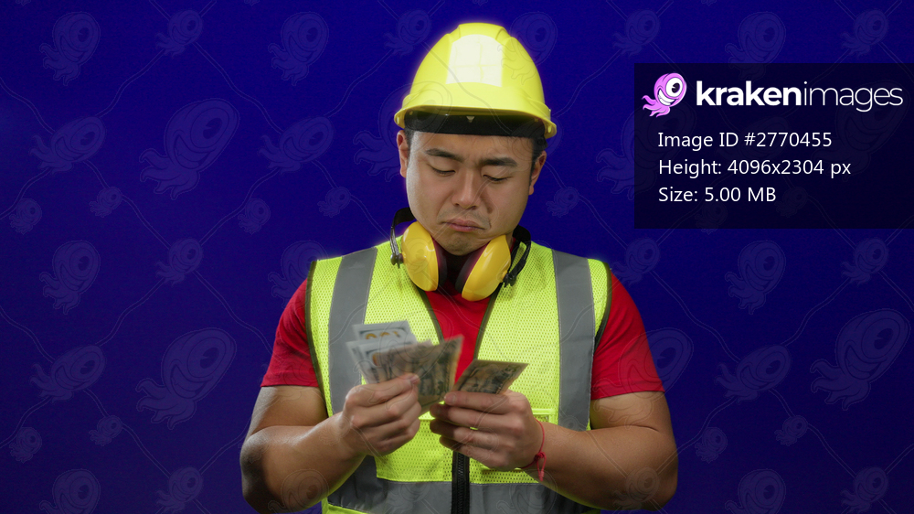 Young man in safety vest and hard hat stands against blue background holding us dollars with a thoughtful expression, representing financial decisions or construction industry. - Kraken Images