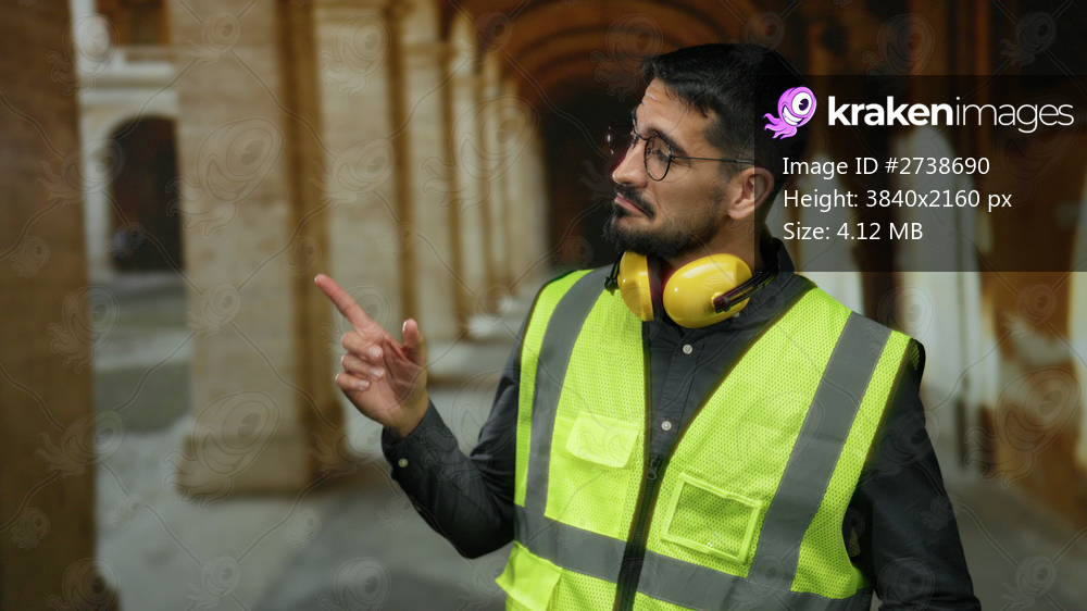 Young man in safety vest and headphones gestures confidently inside an old university building with classic architecture showcasing hispanic heritage.
