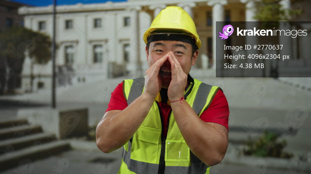 Young man in safety vest and helmet shouting outside university building on sunny day
