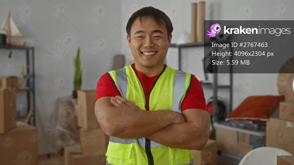 Young man in safety vest standing in an unpacked new home with moving boxes in the background