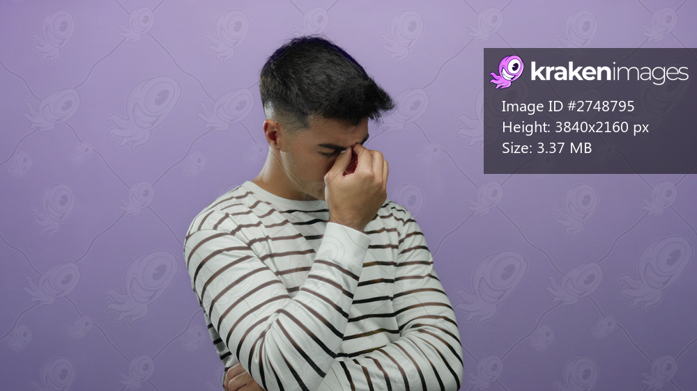 Young man in striped shirt against a purple background looks stressed with hand on face suggesting contemplation or worry in a vivid isolated scene.