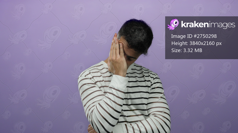 Young man in striped shirt against a purple background looks stressed with hand on face suggesting contemplation or worry in a vivid isolated scene.