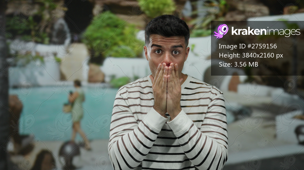 Young man in striped shirt expressing surprise near outdoor pool at resort surrounded by lush greenery and white architecture.