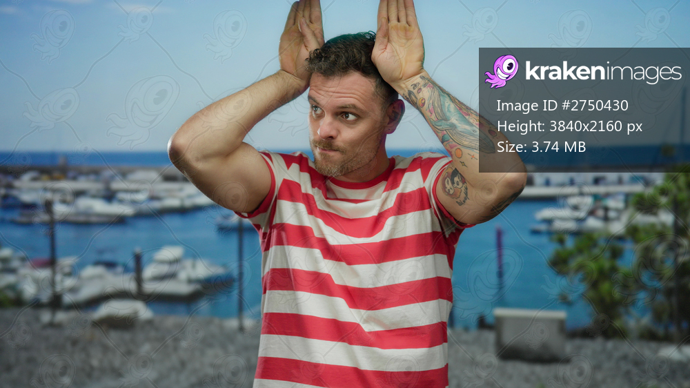 Young man in striped shirt making playful gestures at seaside port with boats and clear blue sky background