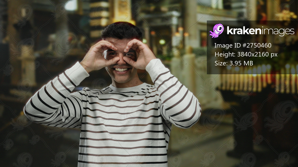 Young man in striped shirt mimicking binoculars indoors at church with candles in the background, conveying a playful and engaging atmosphere.