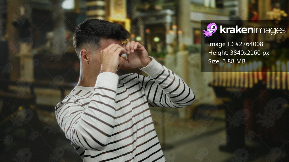 Young man in striped shirt mimicking binoculars indoors at church with candles in the background, conveying a playful and engaging atmosphere.