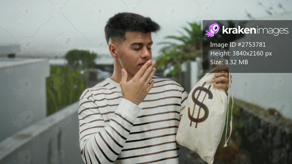 Young man in striped shirt outdoors holding money bag with pensive expression against urban backdrop surrounded by greenery and white buildings showcasing financial choice - Kraken Images
