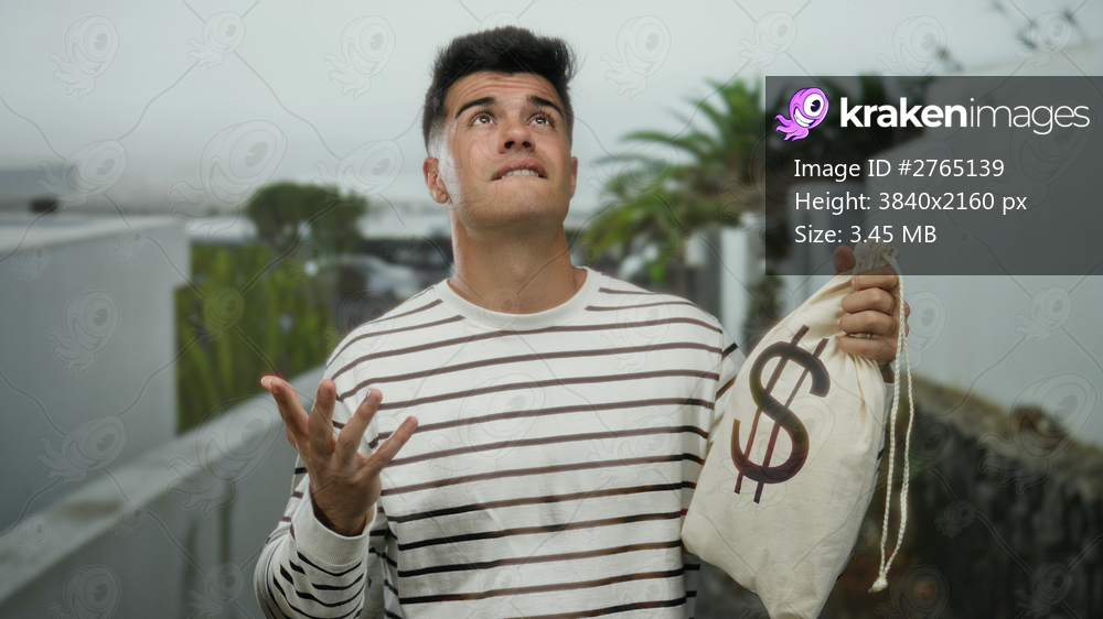Young man in striped shirt outdoors holding money bag with pensive expression against urban backdrop surrounded by greenery and white buildings showcasing financial choice - Kraken Images