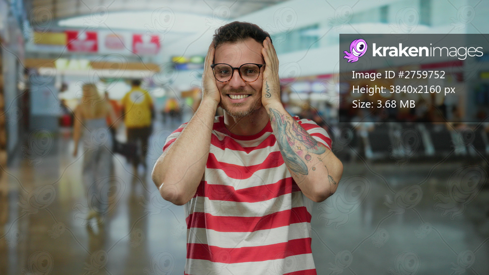 Young man in striped shirt smiling with joy in a busy airport terminal, showcasing his excitement about travel plans, surrounded by passengers and vibrant indoor setting. - Kraken Images