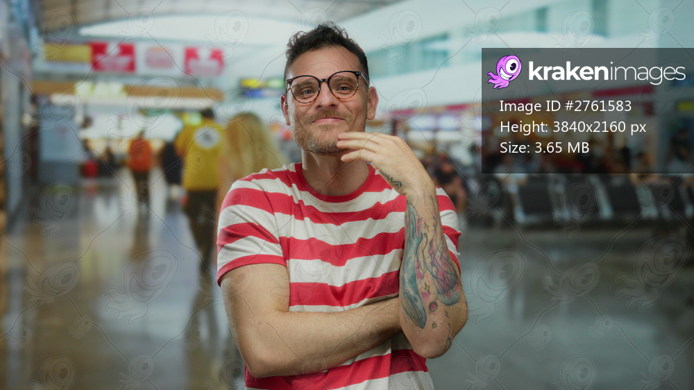 Young man in striped shirt smiling with joy in a busy airport terminal, showcasing his excitement about travel plans, surrounded by passengers and vibrant indoor setting. - Kraken Images