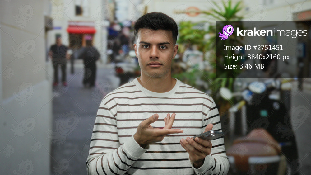 Young man in striped shirt using smartphone on city street surrounded by people and plants, showcasing urban lifestyle and technology interaction outdoors with modern device - Kraken Images