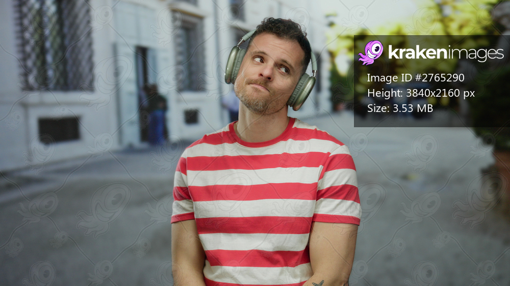 Young man in striped shirt wearing headphones stands outdoors on a city street enjoying music