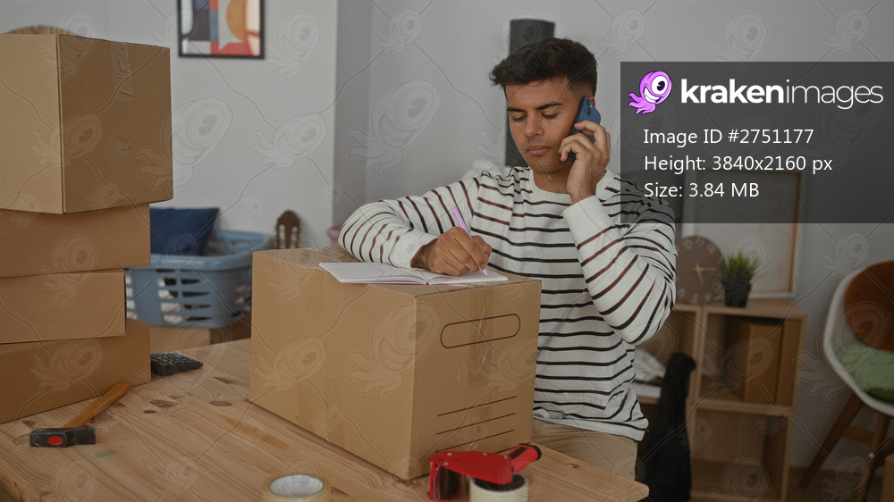 Young man in striped sweater talking on phone while writing on cardboard box in living room surrounded by moving supplies and furniture, illustrating a new apartment setting. - Kraken Images