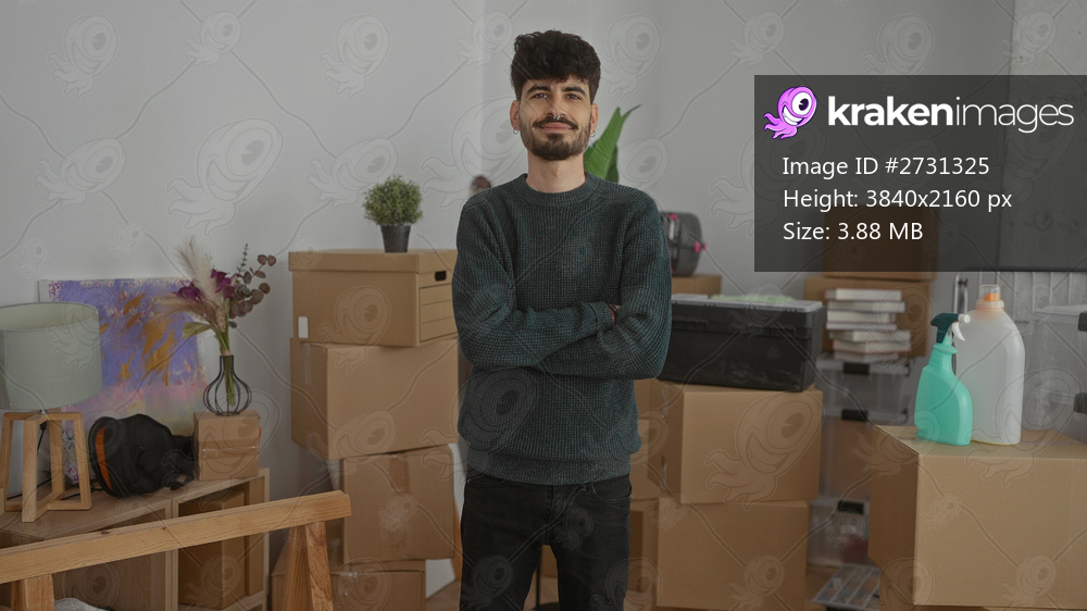 Young man in sweater standing amid moving boxes in new home with plants and decor suggesting an indoor living room setting.