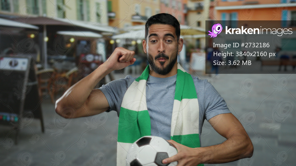 Young man in terrace setting holding soccer ball, displaying excitement, wearing green scarf, highlighting outdoor cafe vibe, surrounded by colorful buildings. - Kraken Images