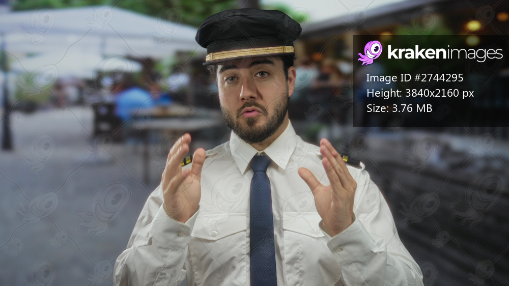 Young man in uniform with beard gestures outdoors on a street with blurred people and trees in the background wearing a black hat and white shirt.