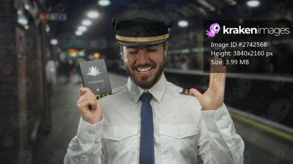 Young man in uniform with beard holds australian passport smiling at indoor railway station in low light showcasing travel and profession.