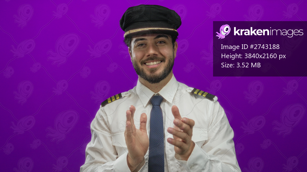Young man in uniform clapping against a vibrant purple background, smiling confidently, with a beard and hat, showcasing a professional and energetic demeanor. - Kraken Images