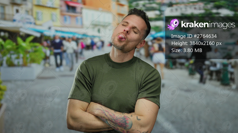 Young man in urban street setting outdoors confidently posing with tattoos and arm crossed while expressing happiness and playfulness in a vibrant city backdrop. - Kraken Images