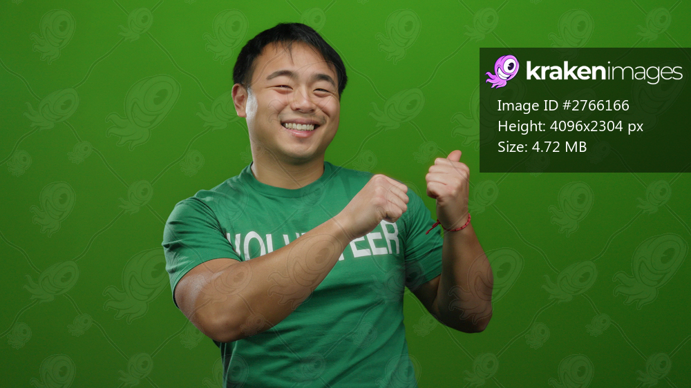 Young man in volunteer shirt smiles over green background, expressing positivity and energy.