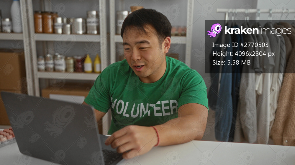 Young man in volunteer shirt using laptop in charity room filled with donation items and supplies.