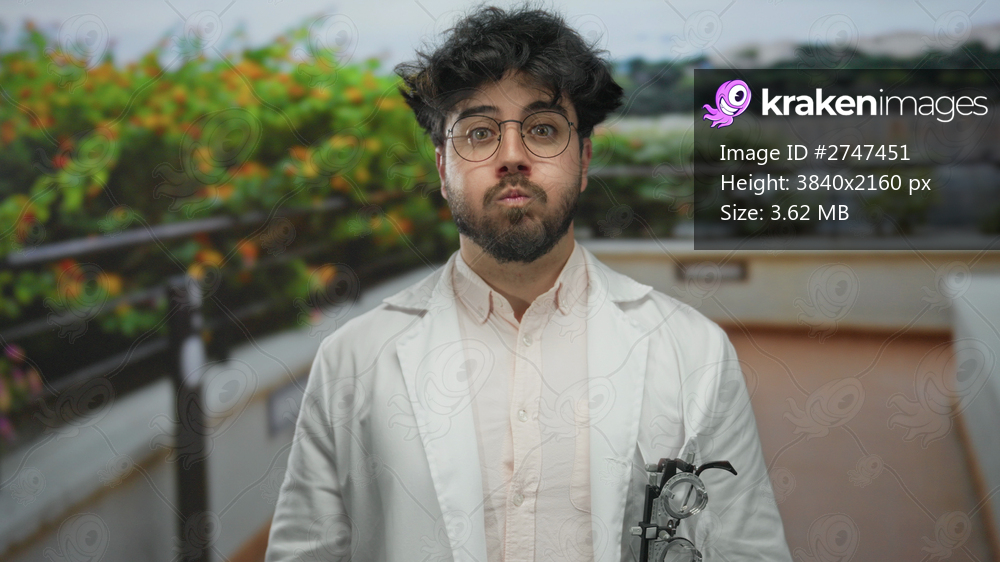 Young man in white coat with beard smiles outdoors on a sunny day featuring vibrant greenery and clear sky suggesting a positive mood.