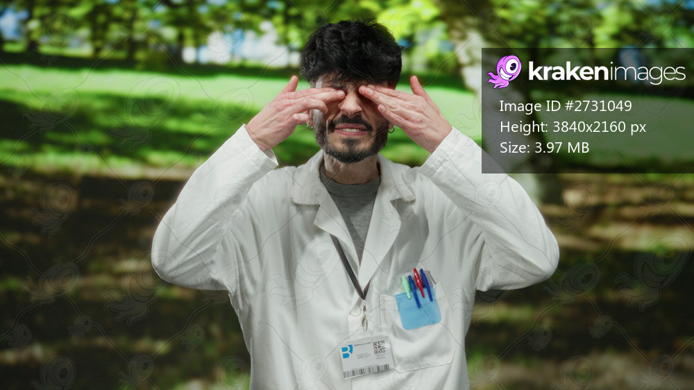 Young man in white coat making funny faces outdoors in a park setting with a backdrop of green trees and grass on a sunny day.