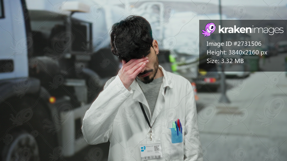 Young man in white coat standing on urban street with trucks in background, displaying focus and determination in a bustling city environment.