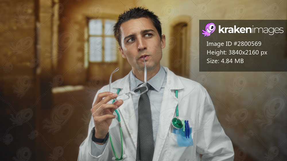 Young man in white coat with stethoscope stands in a historic old town setting, blending modern healthcare with vintage architecture.