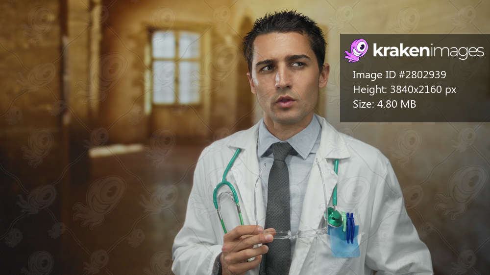 Young man in white coat with stethoscope stands in a historic old town setting, blending modern healthcare with vintage architecture.