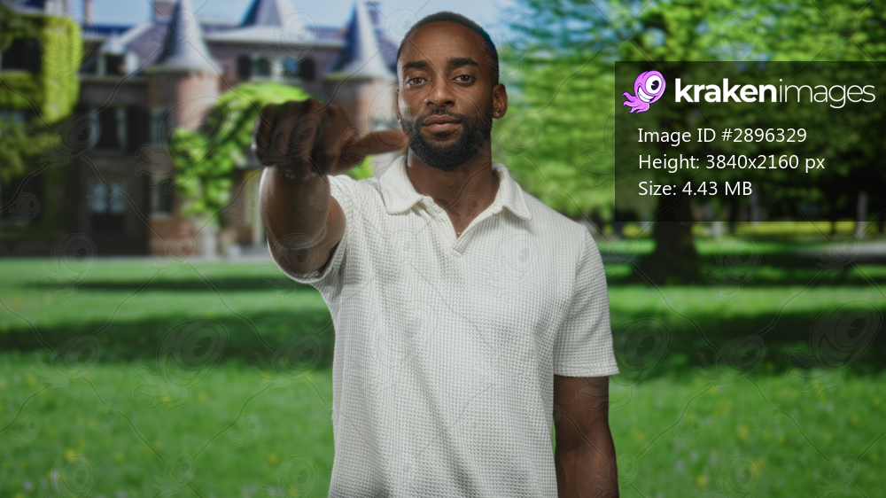 Young man in white polo gives thumbs up with outstretched hand in front of building on green park lawn; confidence encouragement.