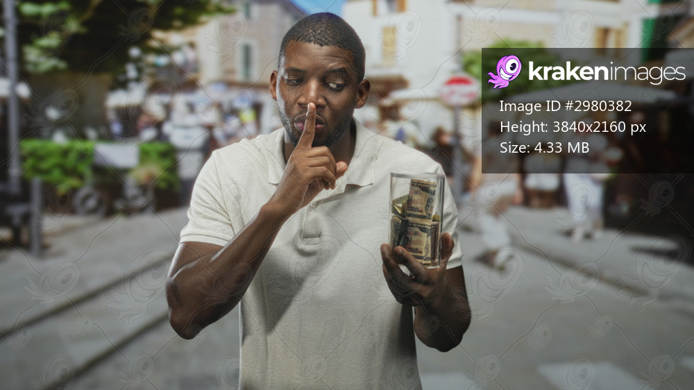 Young man in white polo holding glass jar of dollars, finger to lips for silence in busy street market; secrecy.