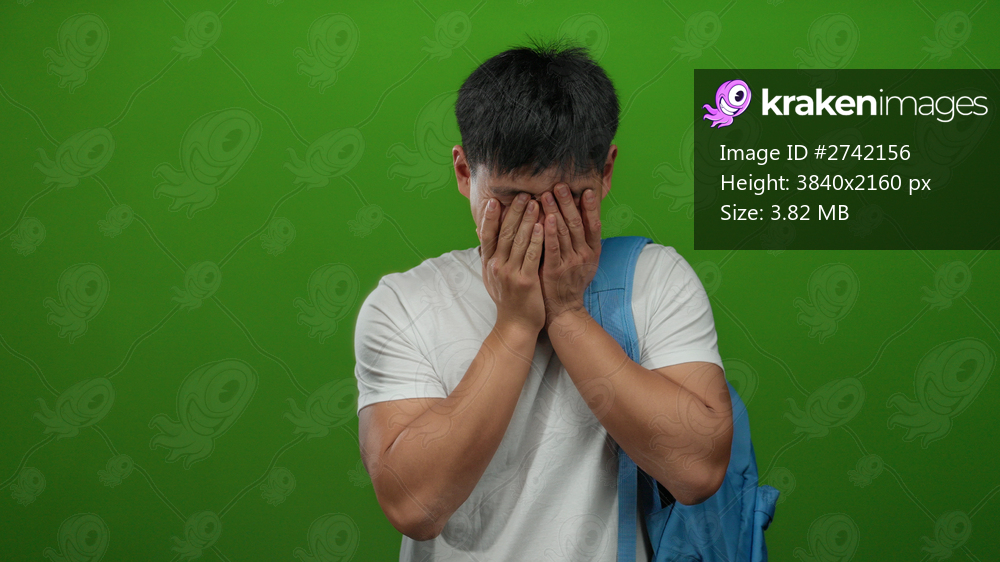 Young man in white shirt and blue backpack stands against green wall appearing stressed and covering his face.