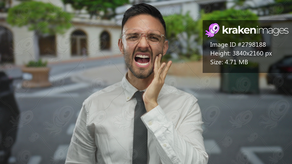 Young man in white shirt expressing discomfort on an urban city street, capturing a moment of dental pain amidst the hustle of modern life.