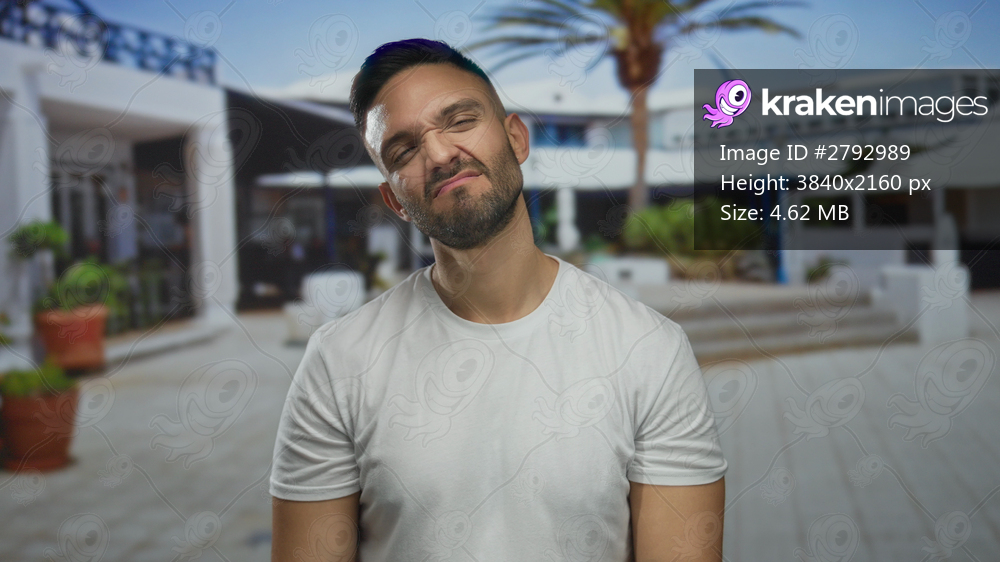 Young man in white shirt expressing excitement in sunny urban outdoor city street.