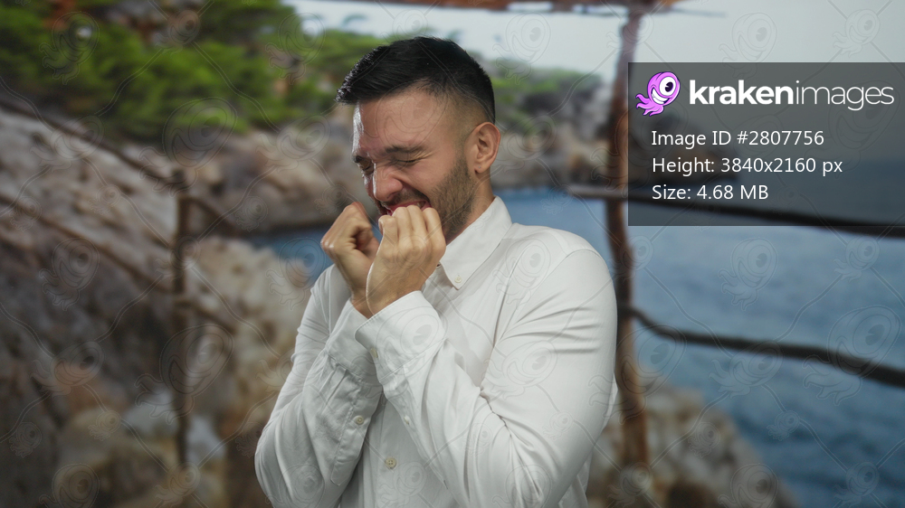 Young man in white shirt expressing fear at the beachside, with the sea and rocky seashore in the background under an outdoor setting.
