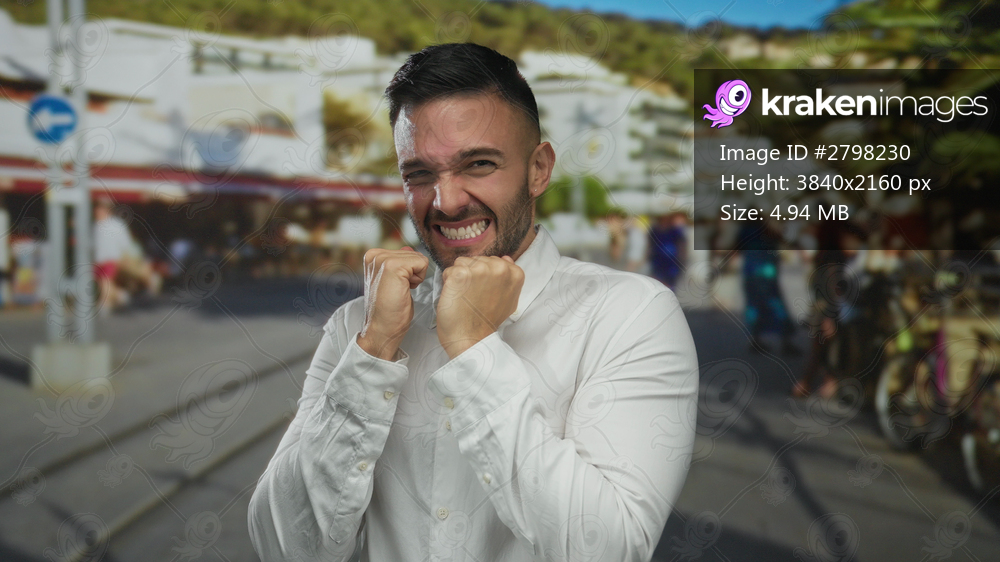 Young man in white shirt expressing fear on a busy urban street with blurred background, capturing a moment of anxiety and uncertainty in a vibrant city atmosphere. - Kraken Images