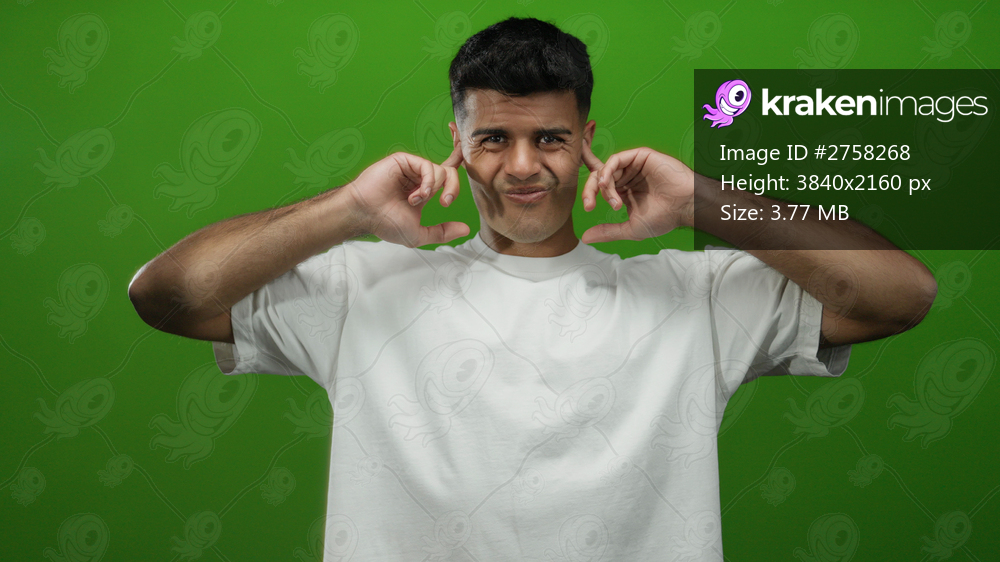 Young man in white shirt with facial expressions covering ears against green background isolated